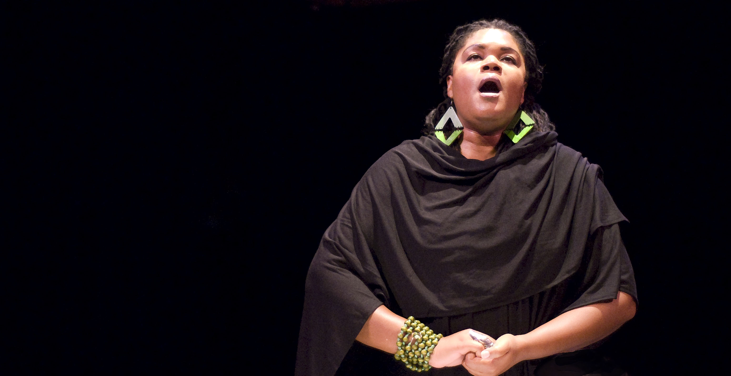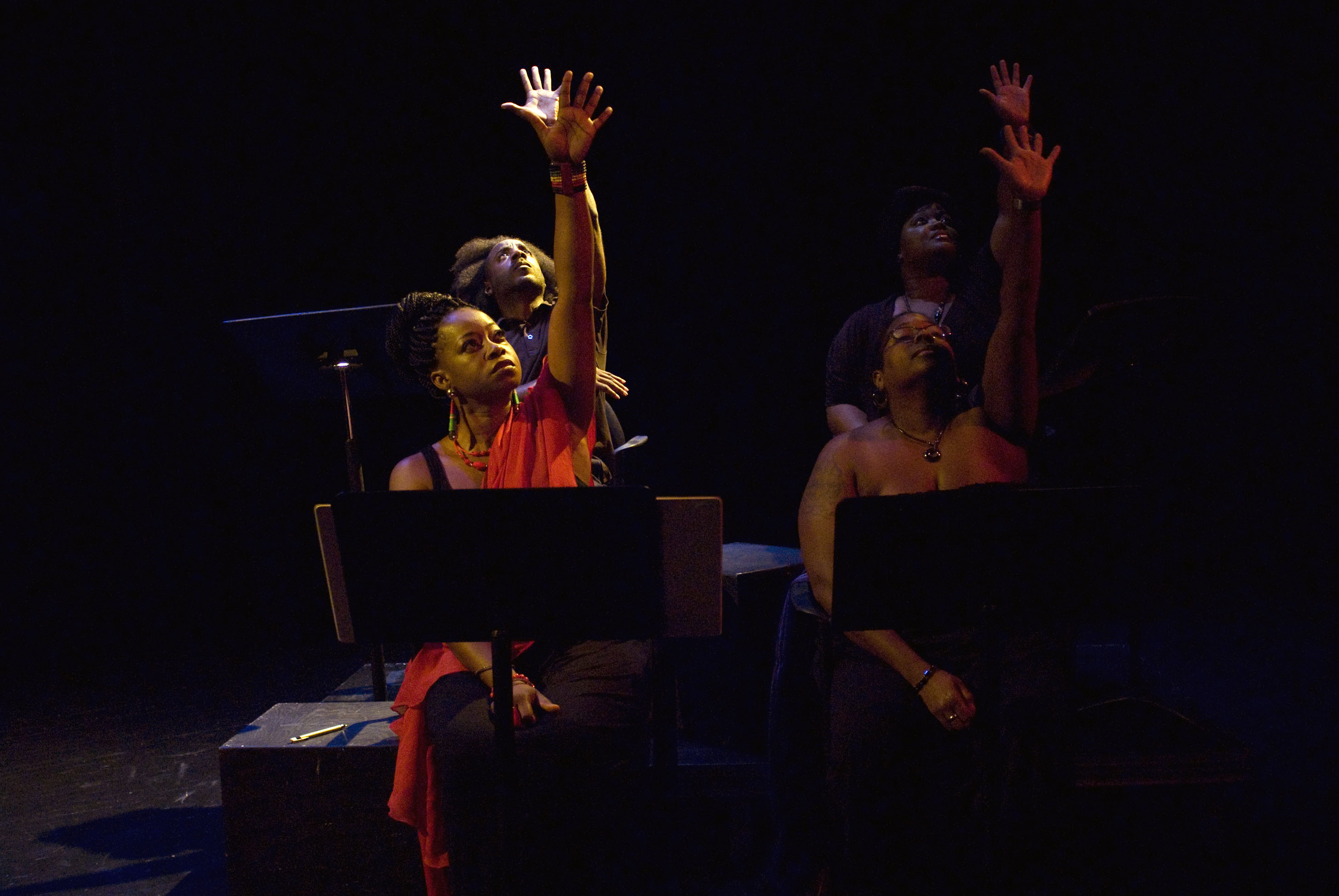 This locomotive style was pronounced throughout the performance with knee- and hip-slapping by the performers who read, sang and danced their way through the trials of slavery up to and through  the modern Jackie Robinson, the clang of integration, while killings, beatings, and the KKK still threatened blacks to stay in their places—separate water fountains, back seats on the bus (if any seat at all!)—stepping aside to let whites pass on sidewalks. The voices of Rosa Parks, Marian Anderson and Mahalia Jackson; the blues and jazz of Duke Ellington, Louis Armstrong, John Coltrane, Dizzy Gillespie, Miles Davis…these were conjured and many heard and others—all threaded throughout this moving poetic narrative.